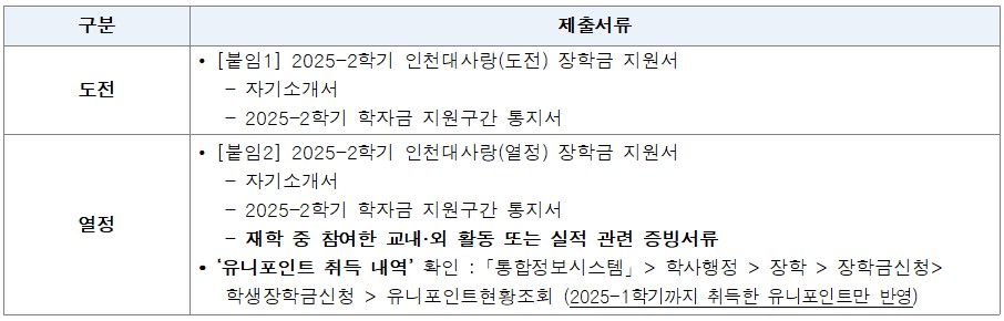 ※ 열정(장학금) 신청자는 자기계발 관련 서류 제출 및 유니포인트 취득 필수